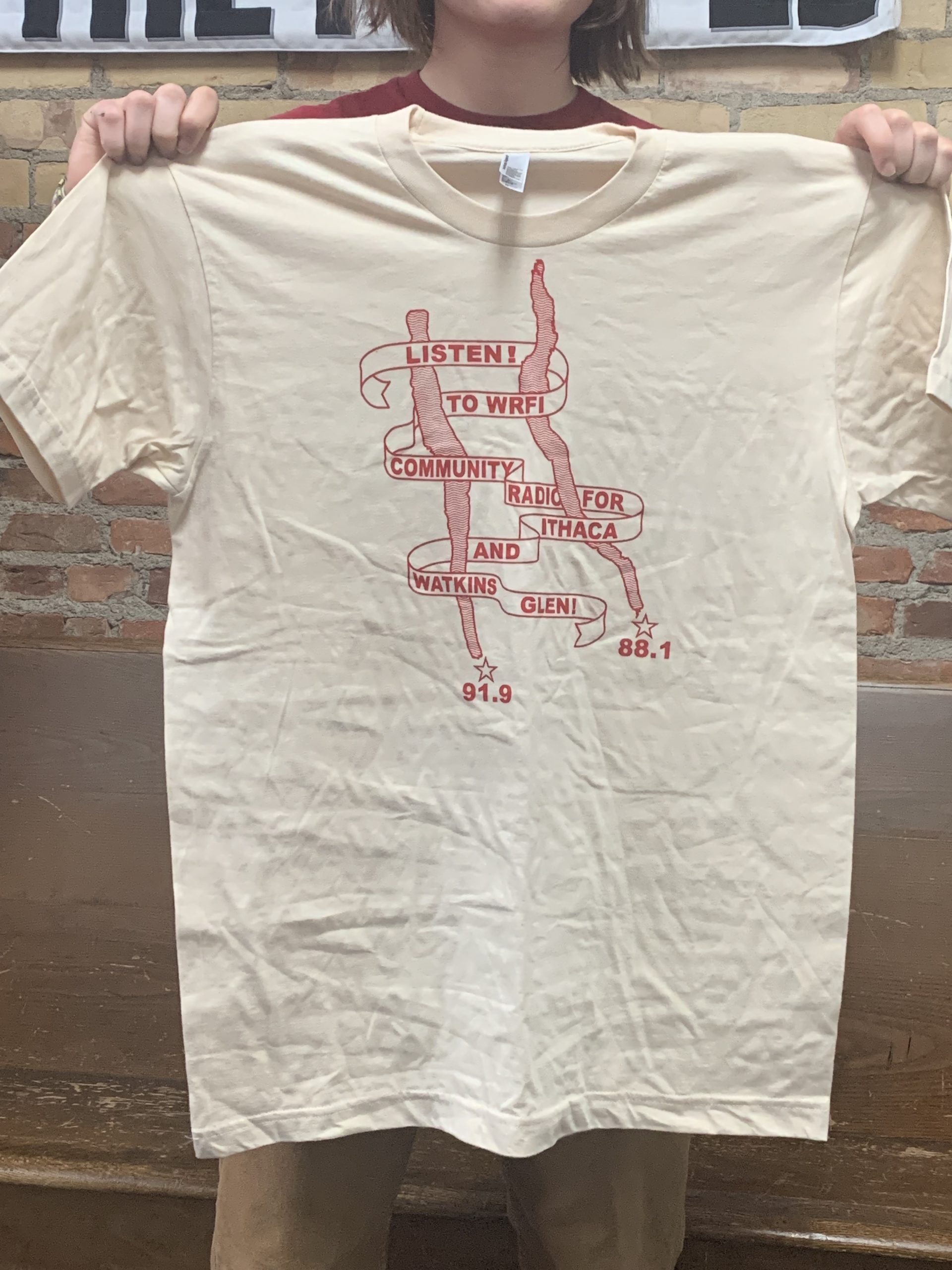 Text reads “Listen to WRFI Community Radio for Ithaca and Watkins Glen – 91.9 and 88.1”