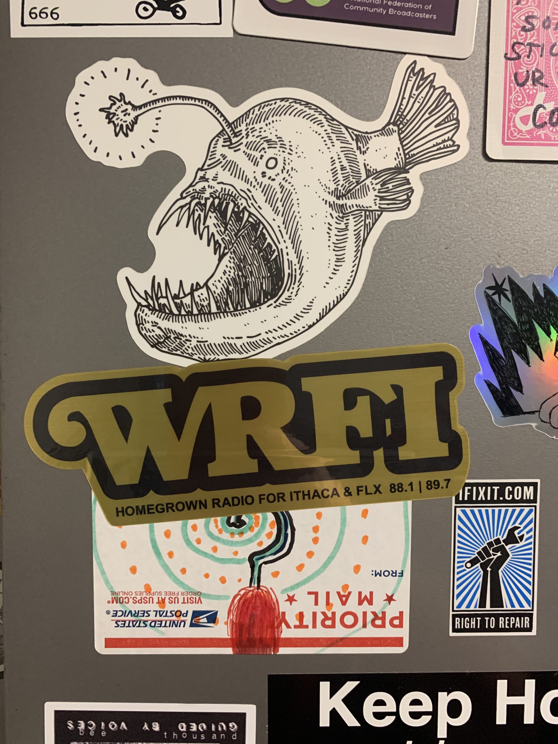 Bring WRFI with you wherever you go with this third iteration of our iconic holographic metallic bumperstickers. This one is gold with green and red flash. Stick ’em to your car, laptop, water bottle, skateboard, CPAP machine, or guitar case. Waterproof and resilient, this one with stick with ya for the long run.
